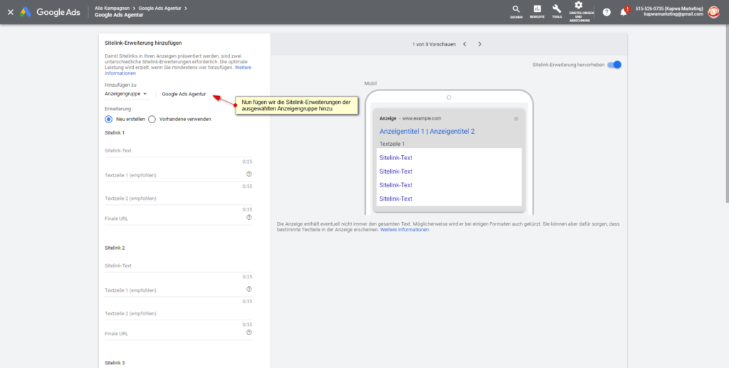 Wir klicken auf den „Pfeil nach unten“ und können im Anschluss daran eine neue Sitelink-Erweiterung hinzufügen: