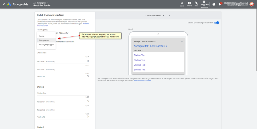 Füge Sitelinks auf Konto-, Kampagnen- und Anzeigengruppenebene hinzu!