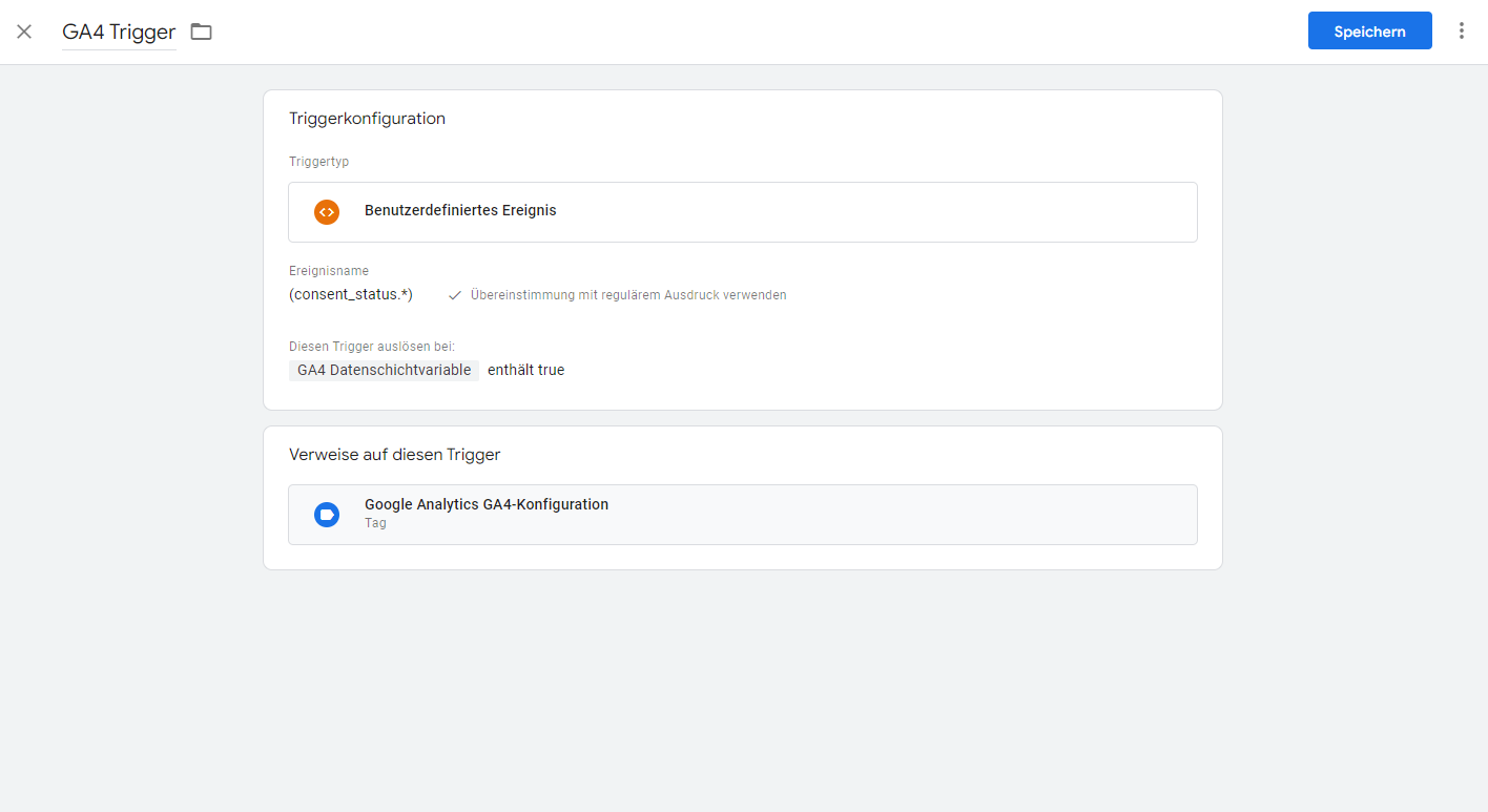 - Nenne den Trigger GA4 Trigger (oder ähnlich) und klicke auf Speichern.